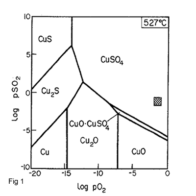 Figure 1 shows the roast products by different PSo2 and PO2 at a temperature of 527 oC .In this figure the shaded square indicates the range of partial pressures in industrial roaster gases.