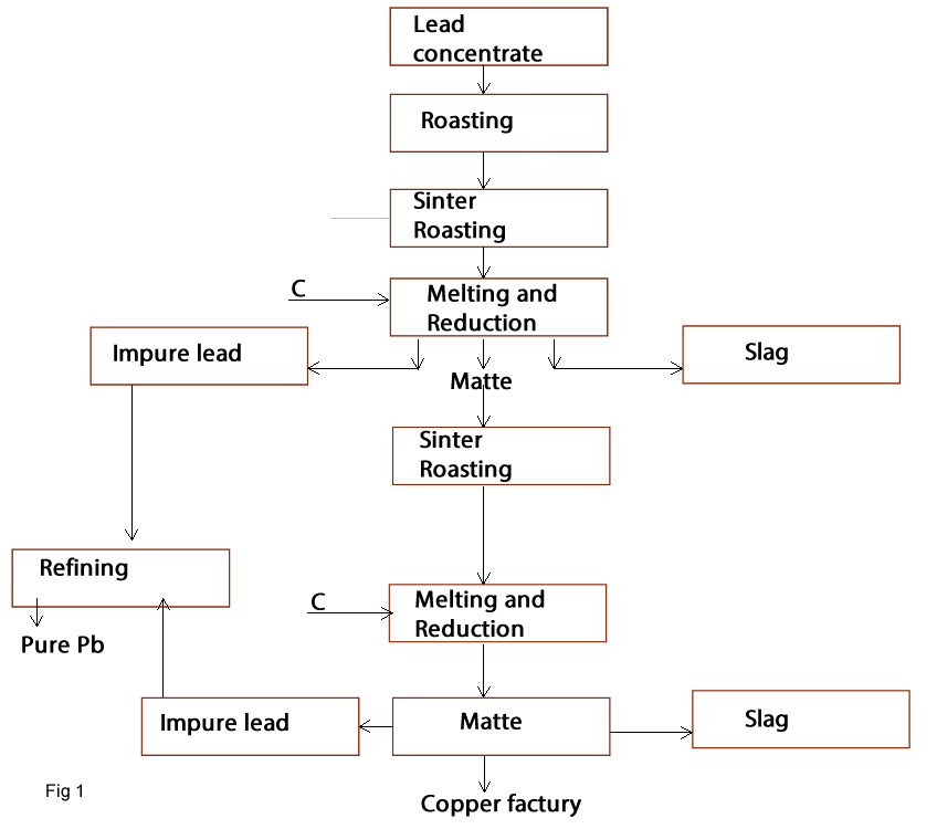 Lead ores or lead concentrate is roasted. This process is most a sintering oxidation to produce a suitable charge for using in the blast furnace. The reduction process will be done in the blast furnace using C and CO as reduction agent.By using these processes; impure lead is produced and it is refined to obtain pure lead. (fig1).