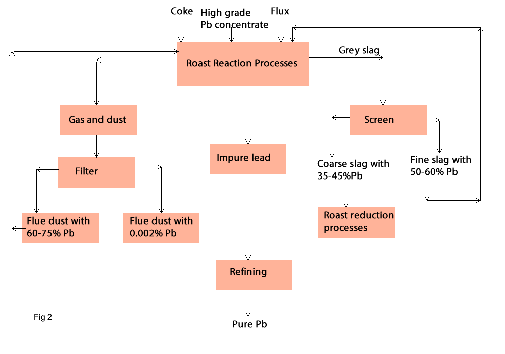 In this process lead sulphide reacts with lead oxide or lead sulphate to form metallic lead and SO2 in the roast reaction. This direct smelting reduction will be carried out in one or two steps in one or two furnaces, but mostly in one furnace (fig2). Today this process is used for high grad concentrate therefore several processes were developed and employed in the industry such as: