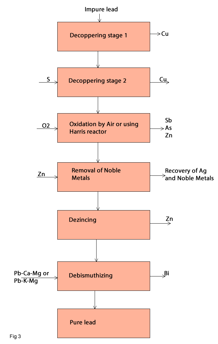 The melting process does not produce pure lead.The produced lead has 96-99% pb. To produce pure lead the refining process must be carried out.Figure 3 show the steps, which should be done to remove the impurities.
